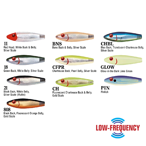 Emits low frequency sonic rattles and life-like action which trigger explosive strikes. Ideal for probing or locating fish on open flats. Sonic “fish calling” rattles can attract fish from great distances. Features Mirrolure ® “built-in” reflective flash and quality hardware. Favorite among many tournament anglers.Â