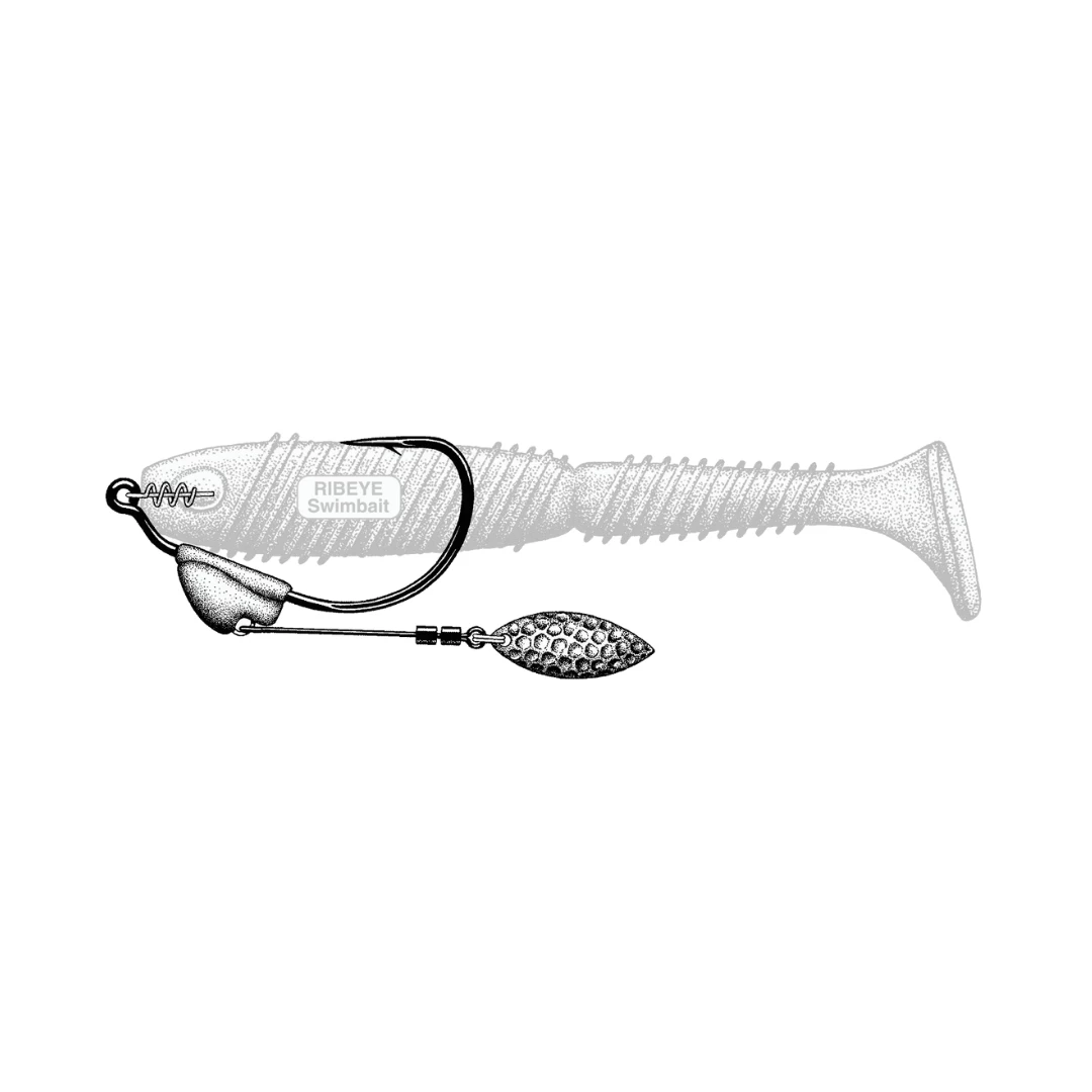 FLASHY SWIMMER with Owner’s TwistLOCK™ Centering-Pin Spring (CPS-patent pending) is a unique setup for rigging soft swimbaits, flukes, and other swimming plastics. The spinner blade is attached to a non-moveable weight that keeps a rigged soft plastic perfectly for use as an ideal “search” bait. In lieu of spinnerbaits or crankbaits, the flashy swimmer can be used as an alternative to cover a lot of water in a short time. A multitude of presentations can be achieved by switching baits and the speed of retrieval. The added weight helps sink or “swim” the rigged bait down into the strike zone, while the blade adds a fish-attracting flash. The wire pivots where attached to the weight, but the design of the molded lead keeps the wire and blade riding horizontally during a steady retrieve. Attached to the wire is a #3 hammered nickel-finished willow leaf blade, rigged with a dual mini swivel. Other features include a TwistLOCK™ “Centering-Pin Spring” (CPS-patent pending) attached to the hook eye, an “open” gap for more positive hook sets, an XX-strong forged shank, Super Needle Point, and black chrome finish.